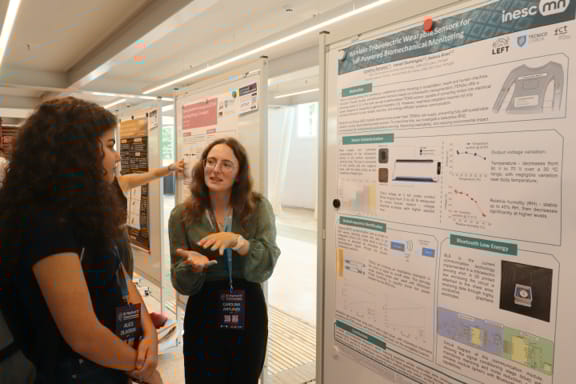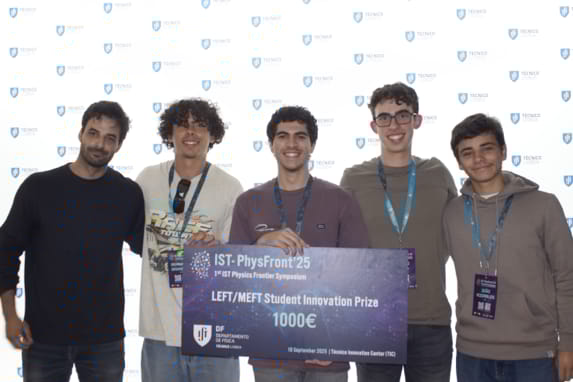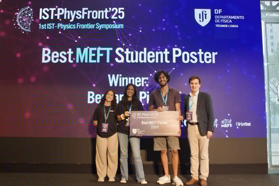 Gonçalo Martins (MEFT) and Duarte Lopes (LEFT) Throughout the day, poster sessions filled the TIC lobby with enthusiasm and an exchange of ideas among students from all three cycles—LEFT, MEFT, and PhD. The papers presented covered topics as diverse as particle physics, astrophysics, quantum optics, sensors, and advanced materials. The audience voted for their favorite posters, and the awards were announced at the end of the day: