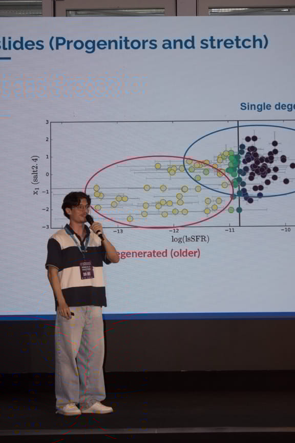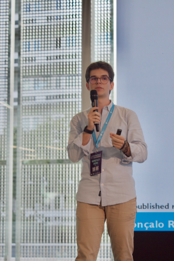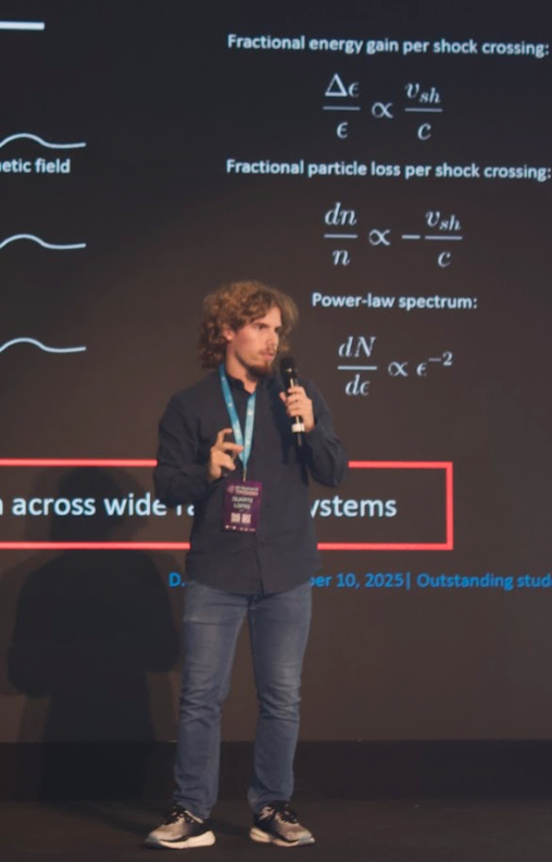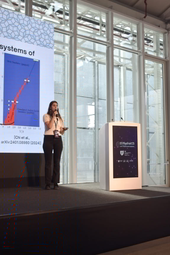 Professor Rogério Colaço (President of IST) at the opening of PhysFront’25 The morning's thematic session featured a panel addressing the application of artificial intelligence in multiple domains of physics. Frederico Fiúza opened the program with "The AI Physicist: Learning Equations from Data," followed by Susana Freitas, who presented "Decoding Touch: Machine Learning and Spintronic Sensors Beneath Magnetic Skins." Giuseppe De Tomasi explored the role of machine learning in nonequilibrium quantum systems, Vasco Guerra addressed the importance of physical coherence in machine learning models, Rúben Conceição highlighted the use of AI in astroparticle experiments, and Marco Piccardo concluded with "Optics that Learn," on adaptive optics and intelligent systems. In the afternoon, the Research Highlight Session showcased some of the broader research themes conducted at DF-IST. Andreas Trautner, Liliana Apolinário, Marta Fajardo, and Richard Brito presented papers ranging from fundamental symmetries in quantum field theory to hadronic collisions, from the interaction of intense lasers with matter to gravitational waves and relativity as a tool for probing new regimes of fundamental physics. One of the most inspiring moments was the Outstanding Student Talks, where four young researchers presented their projects. Duarte Lopes (LEFT) spoke about particle injection mechanisms in astrophysical collisions, Gonçalo Roriz (LEFT) presented the development of ultrafast electronics for FLASH radiotherapy, Mariana Abreu (MEFT) discussed phase transitions in quasi-periodic systems, and Gonçalo Martins (MEFT) addressed the cosmological implications of differences between supernova host galaxies and the tension in the Hubble constant.