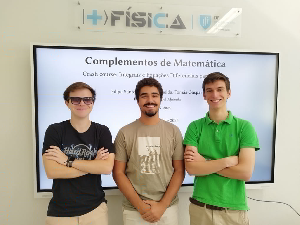 | | Maths Complements for PhysicsSince the beginning of the school year, the "Mathematics Supplements for Physics" initiative has been taking place at Espaço +Física. This initiative was created by three LEFT students (from left to right in the photo below: Filipe Santos, Tomás Gaspar, and Gabriel Almeida) with the support and collaboration of the DF. The project aims to deepen the physics/mathematics preparation of LEFT and MEFT students, strengthening their foundation for Physics curricular units.