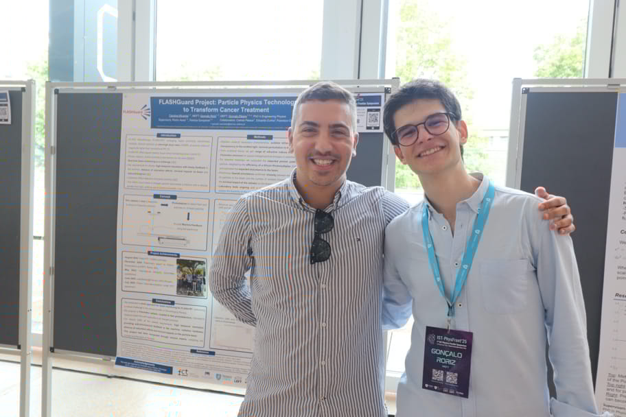 Beatriz Lima, Margarida Nóbrega, Bernardo Picão and Prof, Ilidio Lopes and the FLASHGuard project team (represented by Gonçalo Ribeiro) received the award in the doctorate category with the poster FLASHGuard Project: Particle Physics Technology to Transform Cancer Treatment.