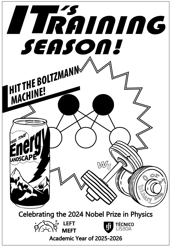 Como tem vindo a ser tradição nos últimos anos, a coordenação da LEFT/MEFT oferece aos novos alunos uma t-shirt alusiva ao tema do Prémio Nobel da Física do ano anterior. Em 2024, o mesmo foi atribuído a John J. Hopfield e Geoffrey Hinton “por descobertas e invenções fundamentais que possibilitam a aprendizagem automática com redes neuronais artificiais”. Este ano, o desenho da t-shirt (ver em cima) foi da autoria do Aluno Gonçalo Oliveira da LEFT. Desejamos a todos os novos estudantes o maior sucesso nesta nova etapa do seu percurso académico. | |