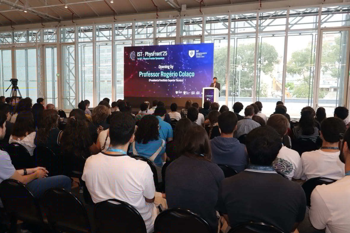 Professor Rogério Colaço (Presidente do IST) na abertura do PhysFront’25 A sessão temática da manhã contou com um painel que abordou a aplicação da inteligência artificial em múltiplos domínios da Física. Frederico Fiúza abriu o programa com “The AI Physicist: learning equations from data”, seguido de Susana Freitas, que apresentou “Decoding Touch: Machine Learning and Spintronic Sensors Beneath Magnetic Skins”. Giuseppe De Tomasi explorou o papel do machine learning em sistemas quânticos fora do equilíbrio, Vasco Guerra abordou a importância da coerência física nos modelos de aprendizagem automática, Rúben Conceição destacou a utilização da IA em experiências de astropartículas, e Marco Piccardo encerrou com “Optics that learn”, sobre óptica adaptativa e sistemas inteligentes. Durante a tarde, a Research Highlight Session deu palco a alguns dos temas mais amplos da investigação feita no DF-IST. Andreas Trautner, Liliana Apolinário, Marta Fajardo e Richard Brito apresentaram trabalhos que vão das simetrias fundamentais na teoria quântica de campos às colisões hadrónicas, da interação de lasers intensos com a matéria às ondas gravitacionais e à relatividade como ferramenta para sondar novos regimes da física fundamental. Um dos momentos mais inspiradores foi o das Outstanding Student Talks, em que quatro jovens investigadores apresentaram os seus projetos. Duarte Lopes (LEFT) falou sobre mecanismos de injeção de partículas em choques astrofísicos, Gonçalo Roriz (LEFT) apresentou o desenvolvimento de eletrónica ultrarrápida para radioterapia FLASH, Mariana Abreu (MEFT) discutiu transições de fase em sistemas quase-periódicos e Gonçalo Martins (MEFT) abordou as implicações cosmológicas das diferenças entre galáxias hospedeiras de supernovas e a tensão na constante de Hubble.