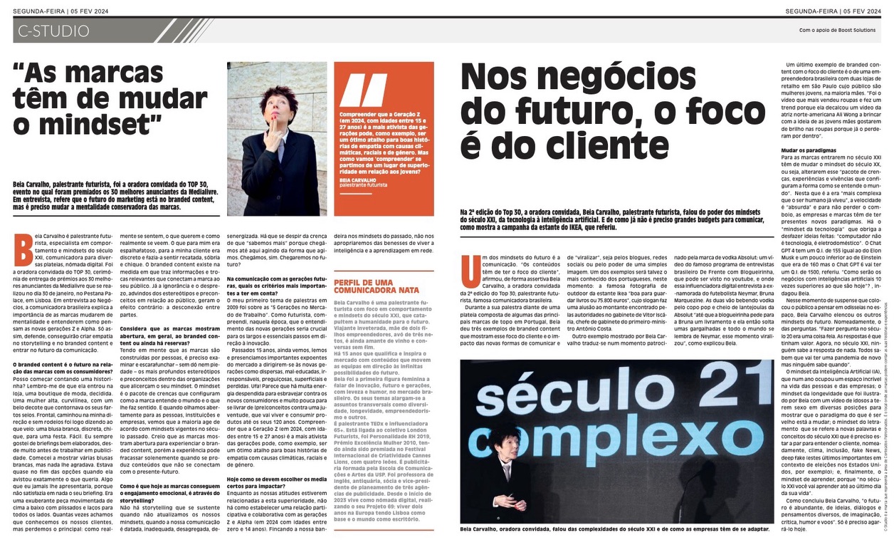 E N T R E V I S T A Em entrevista, refere que o futuro do marketing está no branded content, mas é preciso mudar a mentalidade conservadora das marcas. 5 FEV 2024 ____________________________________________________________ Em entrevista ao Negócios, a comunicadora brasileira explica a importância de as marcas mudarem de mentalidade e entenderem como pensam as novas gerações Z e Alpha. Só assim, defende, conseguirão criar empatia no storytelling e no branded content e entrar no futuro da comunicação. | |